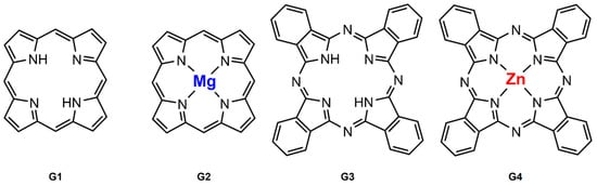 Photosensitizers used in this work. From left to right, 21H,23H-porphine (G1), Mg(II)-porphine (G2), 29H,31H-phthalocyanine (G3) and Zn(II)-phthalocyanine (G4).