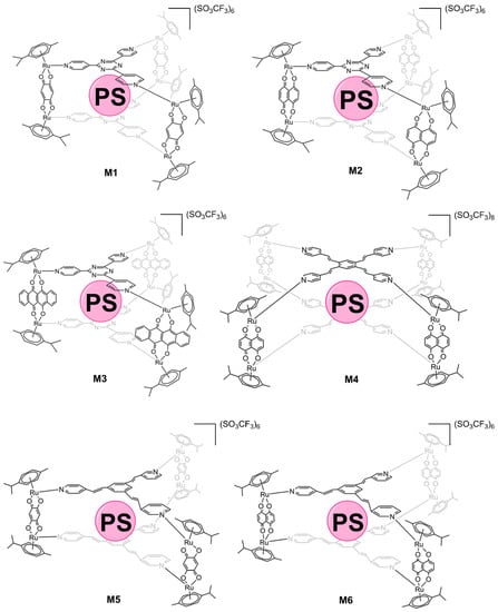 Structures of ruthenium(II) metallacages used in this work. The photosensitizer is represented by a sphere (PS), 21H,23H-porphine (G1) was inserted in M1–M6, Mg(II)-porphine (G2) in M1, M4, and M6, 29H,31H-phthalocyanine (G3) and Zn(II)-phthalocyanine (G4) in M4–M6.