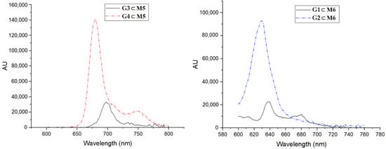 Emission spectra of M5 with G3 or G4 (left) and M6 with G1 or G2 (right), in DMSO at 25 °C (10 nM concentration).
