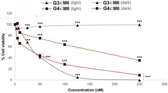 MTT assays of G3⊂M6 (black) and G4⊂M6 (red), in the dark (dashed line) and after irradiation (solid line). Statistical significance determined by the two-tailed unpaired Student’s t-test, p-value < 0.001 (***).