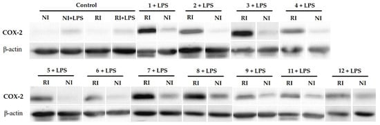 Effects of the systems tested on COX-2 expression after PDT. The numbers correspond to the entries in Table 1. Cells (2 × 106) were cultured in DMEM medium (FBS 10%, L-glutamine 1%, penicillin 100 U/mL, Streptomycin 100 µg/mL) for 24 h and treated with the corresponding system G⊂M. After 24 h, the medium was replaced by a DMEM medium without red phenol, and then irradiated (RI) or not (NI) by 630 nm irradiation (40 mW/cm2, 30 min). After 18 h, LPS (1 µg/mL) was added to the medium to stimulate the expression of COX-2, and 4 h later the trypsination was carried out. COX-2 expression was determined by Western Blot and β-actin was used as a protein loading control. All experiments were done in triplicate.