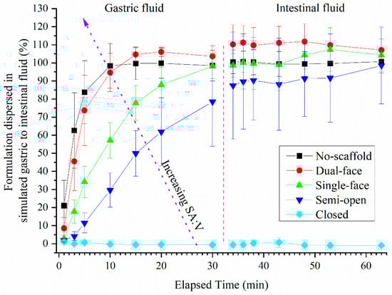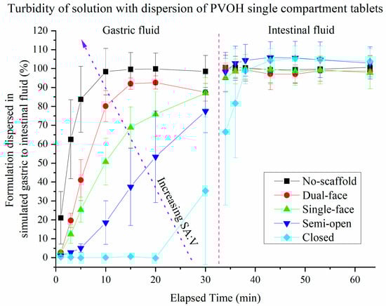 Non-dissolving PLA scaffolds: The SMEDDS without a scaffold, with the highest SA:V of 0.8, reached a peak turbidity of 98% dispersed within 10 min (essentially complete). The semi-open tablets reached a level of dispersion approximately 78% of the fully dispersed control SMEDDS within 30 min. Closed type PLA-based tablets displayed essentially no release and appeared to remain closed throughout the dispersion. During the intestinal phase of the dispersion, the no-scaffold and single-face types plateaued at ~100% dispersed, while the dual-face types plateaued at ~110%. The semi-open type tablets plateaued at ~90% (albeit with large error bars due to variation apparent for individual units). The order of dispersion rate ranked as expected as: no-scaffold > dual-face > single-face > semi-open, closed did not disperse.