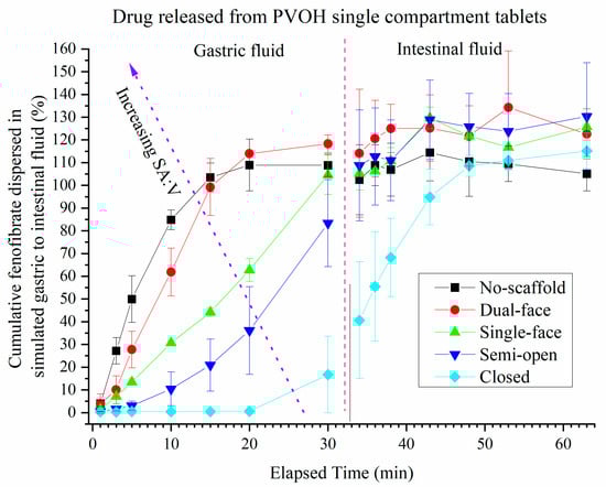 The effect of tablet format on the release kinetics of FEN from the PLA-based scaffolds, determined using HPLC, is demonstrated in Figure 8. FEN was released almost completely from the no-scaffold-type tablets (SA:V = 0.8) within 10 min. The semi-open type formulations released 30% of the FEN within 30 min, while practically no FEN was released from the closed-type PLA-based tablets which as mentioned in the turbidity studies remained closed throughout the entire dispersion. During the intestinal phase of the dispersion, the drug release from the no-scaffold-type tablets plateaued at ~105% while the dual-face and single-face scaffolds increased to between 85% and 105% of FEN. The semi-open-type tablets demonstrated variable but continual release of FEN throughout gastric and intestinal phases. The order of release of FEN from the scaffolds logically followed the order of dispersion of the SMEDDS.