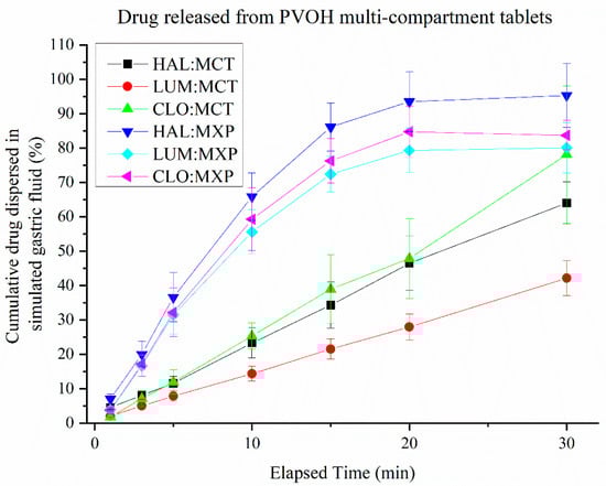 The release kinetics of model drugs HAL, LUM and CLO released from multicompartment tablets (Figure 4) and mixed drug pellet tablets (Figure 5, where all compartments of the multicompartment tablet have effectively been mixed into one) are displayed in Figure 11. Drug release from the mixed drug pellet was faster than release from the multicompartment system. The drug release from multicompartment tablets was approximately linear and directly proportional to time spent in dispersion media. The release of LUM from multicompartment tablets was slower than the other drugs, while all drugs from the mixed drug pellets appear to release at a similar rate and plateau after 20 min. By 20 min, the release of HAL, CLO and LUM reached 90%, 80% and 75% of total mass, respectively. In contrast, the release of HAL, CLO and LUM from the multicompartment systems reached 60%, 75% and 40% of total mass, respectively, at 30 min. Complete dispersion of the pellet could not be determined visually due to the high opacity of the dispersion media.