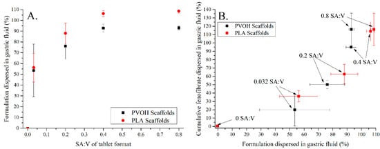 (A) Relationship between dispersion of the formulation and surface area-to-volume ratio (SA:V) and(B) the dependence of drug release on dispersion of the formulation across the range of SA:V studied. Black symbols indicate PVOH-based scaffolds; red symbols indicate PLA-based tablets after 20 min of dissolution time in simulated gastric media.