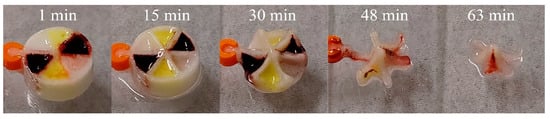 Photo series demonstrating the erosion of PVOH multicompartment tablets when retrieved form the dispersion medium at different time points (see Figure S3 for full photoset).