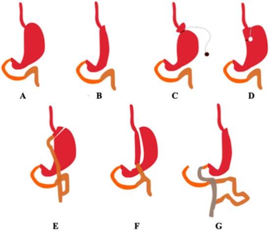 Selected types of bariatric procedures. The organs are marked with the following colours: duodenum—orange, the jejunum—brown, and the ileum—grey. (A) Correct anatomy, (B) sleeve gastrectomy, (C) adjustable gastric banding, (D) vertical banded gastroplasty, (E) Roux-en-Y gastric bypass, (F) mini gastric bypass, (G) biliopancreatic diversion with duodenal switch. (Authors’ original design).