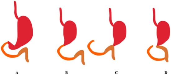 - Stange, D.E.; Weitz, J. Methods of Reconstruction—BI, BII, Roux-en-Y, Jejunal Interposition, Proximal Gastrectomy and Pouch Reconstruction. In Gastric Cancer; Strong, V., Ed.; Springer: Cham, Switzerland, 2015; pp. 175–183. [Google Scholar]