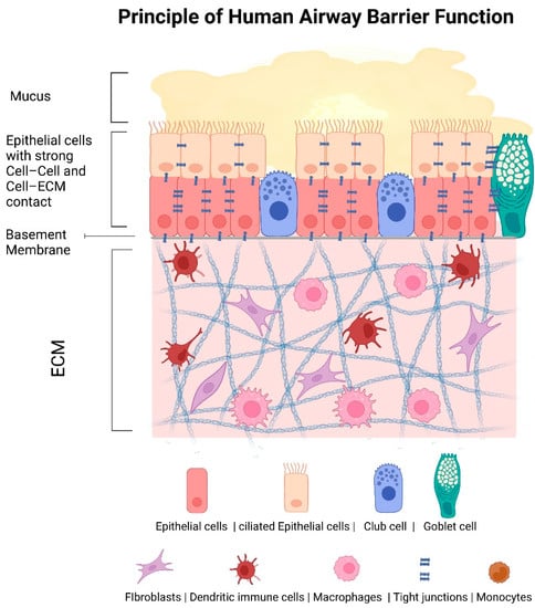 Cellular composition of the epithelial and subepithelial layers of the lower airway tract. The human lower airway tissue possesses a mucus barrier and an epithelial barrier through strong cell–cell and cell–ECM contacts. The epithelial layer contains ciliated cells that remove particles and pathogens through their cilia movement, nonciliated epithelial cells, and goblet and club cells. The subepithelial layer harbors, besides fibroblasts, also different immune cells like dendritic cells, monocytes, and macrophages. ECM—extracellular matrix. This figure was created with BioRender.com (accessed on 7 December 2021).