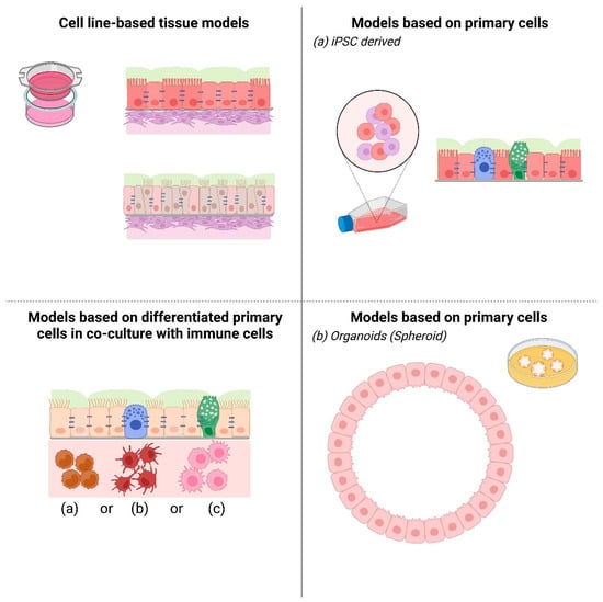 For this reason, more and more scientific teams have focused on using methods of tissue engineering or modern cell biology [] to develop human tissue models that are suitable for the investigation of defined mechanisms. To generate these airway tissue models, cell lines, differentiated primary airway epithelial cells, induced pluripotent stem cells, and organoids were applied (Figure 2).