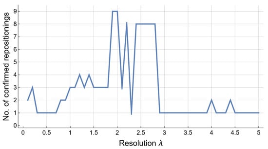 | Algorithm 1 Find the parameter , such that the clustering of nodes/drugs in with modularity resolution (i.e., ) produces the biggest number of repositionings confirmed with the level 1 ATC codes in DrugBank 5.1.8. |
