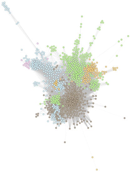 - Bastian, M.; Heymann, S.; Jacomy, M. Gephi: An open source software for exploring and manipulating networks. In Proceedings of the Third international AAAI Conference on Weblogs and Social Media, San Jose, CA, USA, 17–20 May 2009. [Google Scholar]