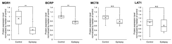 Protein expression level of the AED transporters in epileptic brain capillaries compared to controls. Brain capillaries were isolated from focal sites in six epilepsy patients and five normal brains; tryptic digests were produced and subjected to SWATH analysis. The band inside the box represents the median, and the bottom and top of the box indicate the first and third quartiles, respectively. Whiskers indicate the minimum and maximum values of the protein levels. X plots show the average in each group. The data are normalized by the median for the protein expression level in controls. ** BH-adjusted p value < 0.01, significantly different between epilepsy and control groups. N.S., not significantly different. MDR1, Multidrug resistance protein 1; BCRP, Breast cancer resistance protein; LAT1, L-type amino acid transporter 1; MCT8, Monocarboxylate transporter 8.