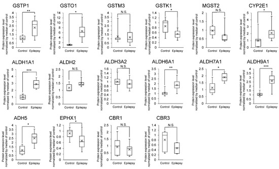 Protein expression level of AED-metabolizing enzymes in epileptic brain capillaries compared to controls. Brain capillaries were isolated from focal sites in six epilepsy patients and five normal brains; tryptic digests were produced and subjected to SWATH analysis. The band inside the box represents the median, and the bottom and top of the box indicate the first and third quartiles, respectively. The whiskers indicate the minimum and maximum values for the protein levels. X plots show the average in each group. The data are normalized by the median of the protein expression level in controls. * BH-adjusted p value < 0.05, ** BH-adjusted p value < 0.01 and *** BH-adjusted p value < 0.001, significantly different between the epilepsy and control groups. N.S., not significantly different. GSTP1, Glutathione S-transferase pi; GSTO1, Glutathione S-transferase omega-1; GSTM3, Glutathione S-transferase Mu 3; GSTK1, Glutathione S-transferase kappa 1; MGST2, Microsomal glutathione S-transferase 2; CYP2E1, Cytochrome P450 2E1; ALDH1A1, Aldehyde dehydrogenase family 1 member A1; ALDH2, Aldehyde dehydrogenase 2; ALDH3A2, Aldehyde dehydrogenase family 3 member A2; ALDH6A1, Aldehyde dehydrogenase family 6 member A1; ALDH7A1, Aldehyde dehydrogenase family 7 member A1; ALDH9A1, Aldehyde dehydrogenase family 9 member A1; ADH5, Alcohol dehydrogenase 5; EPHX1, Epoxide hydrolase 1; CBR1, Carbonyl reductase 1; CBR3, Carbonyl reductase 3.