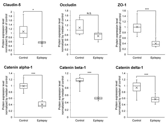 Protein expression level of tight junction and adherence junction proteins in epileptic brain capillaries compared to controls. Brain capillaries were isolated from focal sites in six epilepsy patients and five normal brains; tryptic digests were produced and subjected to SWATH analysis. The band inside the box represents the median, and the box’s bottom and top indicate the first and third quartiles, respectively. The whiskers indicate the minimum and maximum values of the protein levels. X plots show the average for each group. The data are normalized by median of the protein expression level in control. * BH-adjusted p value < 0.05 and *** BH-adjusted p value < 0.001, significantly different between epilepsy and control groups. N.S., not significantly different.