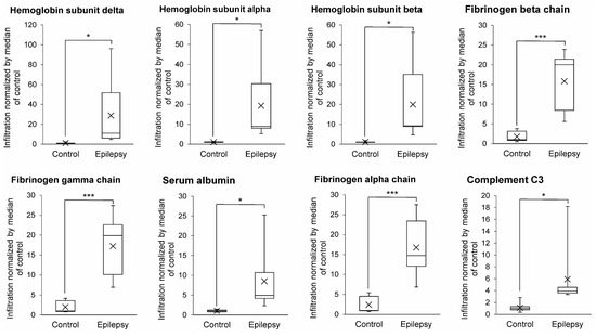 Infiltration of blood proteins in epileptic brain capillaries compared to controls. Brain capillaries were isolated from focal sites in six epilepsy patients and five normal brains; tryptic digests were produced and subjected to SWATH analysis. Blood proteins are defined as the molecules whose tissue specificity in the Uniprot database is classified as ”blood” or “plasma”. Among such molecules, the proteins showing the average ratio (Epilepsy/Control) > 5 and BH-adjusted p value < 0.05 are shown in this table. The band inside the box represents the median, and the bottom and top of the boxes indicate the first and third quartiles, respectively. The whiskers indicate the minimum and maximum values of the protein levels. X plots show the average in each group. The data are normalized by median of the infiltration in control. * BH-adjusted p value < 0.05 and *** BH-adjusted p value < 0.001, significantly different between epilepsy and control groups.