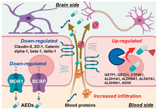 The integrity of the tight junctions at the BBB is also a factor that influences the brain permeability of AEDs. It has been reported that the systemic administration of pentylenetetrazol or kainic acid increases the infiltration of albumin into the brain in rabbit and rat models of epilepsy [13,14]. Immunohistochemical staining has also shown that albumin infiltrates into the brain in focal areas of epilepsy patients [13]. As a mechanism for BBB disruption, it has been reported that the expression of tight junction proteins such as ZO-1, Occludin, Claudin-1 and Claudin-5 is decreased at the BBB in epileptic rat models [15]. However, it is not known to what extent the expression of these tight junction molecules is reduced at the BBB of epilepsy patients, or whether the tight junction is disrupted to the same extent as at the BBB of epileptic rat models.
