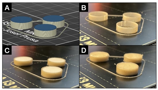 Each model was sliced into 27–30 layers (4.1–4.5 mm overall height of the cylinder) depending on the matrix tablet height, where the thickness of the first layer was 0.2 mm and the thicknesses of the other layers were 0.15 mm. The height of the cylindrical 3D model was adjusted to the precise height of the matrix tablet. During this step, the operation pause of the process was also added (see Figure 2A; the color change of the layers indicates the moment of stopping the 3D printing process), which enabled insertion of the matrix tablet.