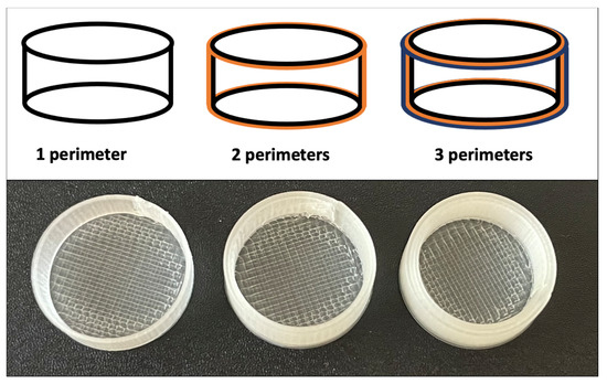 It can also be seen that increasing the 3D coating thickness (number of perimeters) is undemanding, reproducible, and does not require much extra time. However, it is important to bear in mind that the coating thickness is directly related to the nozzle diameter of the 3D printer, and it is not possible to prepare thinner coatings than this value.