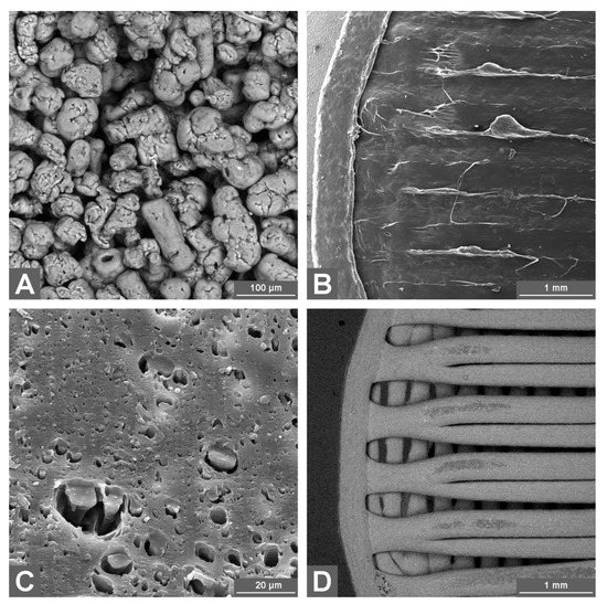 Representative SEM images of the AFF powder (A), detail of the AFF coating (B), detail of the cross-section area of the PVA filament (C), and detail of the PVA coating (D).