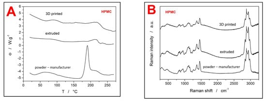 (A) DSC traces of the as-purchased (powdered) HPMC, extruded HPMC filament, and 3D-printed HPMC structure. The exothermic effects evolve in the upwards direction. (B) Raman spectra of the three studied HPMC forms.