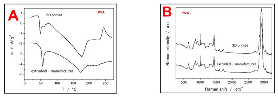 (A) DSC traces of the as-purchased extruded PVA filament, and 3D-printed PVA structure. The exothermic effects evolve in the upwards direction. (B) Raman spectra of the two studied PVA forms.