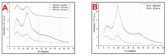 (A) Powder X-ray diffraction characterization of Affinisol in different forms (powder, filament, 3D-printed sample) and (B) PVA as a commercial filament and 3D printed form.