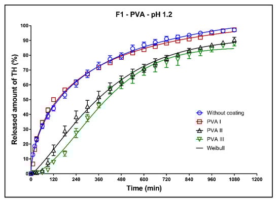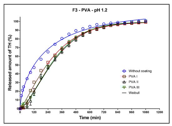 - The PVA coating did not influence the release mechanism of the model drug during the dissolution test in the acidic dissolution medium. The maximum released amount of the model drug from the formulation F1 (hydrophilic) was the same for the tablets without coating and for the tablets coated by one perimeter PVA. The coating by two and three perimeters of PVA decreased the maximum released amount of the model drug by ~10%. The maximum released amount of TH from the formulations F2 (lipophilic) and F3 (hydrophilic-lipophilic) was not influenced by the PVA coating.