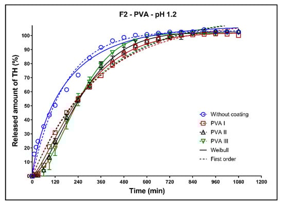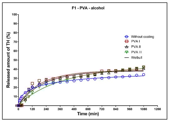In order to quantitatively evaluate the released amount of the model drug (TH) from the studied coated and uncoated formulations, the time dependences of the released amount of TH were fitted by the first-order kinetic model (Equation (1)) and the Weibull model (Equation (2)).
