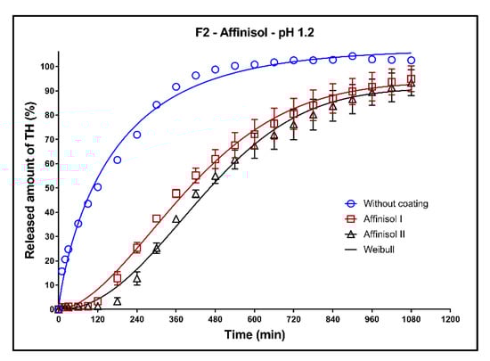 Formulation F3: Additionally, in the case of the F3 formulation, the coated tablets were resistant against the dissolution media for 2 h (Figure 19). The uncoated, AFF I, and AFF II tablets exhibited the maximum released TH amounts of 80, 90, and 37%, respectively. The dissolution profile of AFF II tablets exhibited a sigmoidal character, which confirmed the change of the mechanism of TH release compared to the uncoated tablets and AFF I tablets. On the other hand, the dissolution profile of AFF I tablets after 2 h of the dissolution was almost linear.