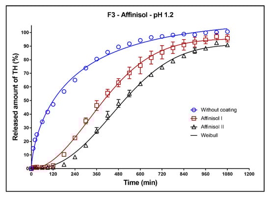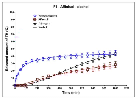 Dissolution profiles of F1 formulation in alcoholic medium (40% of alcohol) fitted to the Weibull model: uncoated tablets and tablets with Affinisol coating (two values of the perimeter thickness).