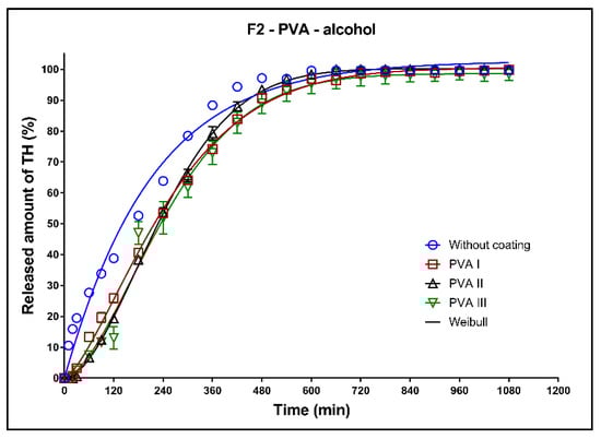 Formulation F2: All dissolution profiles were fitted to the Weibull model. The maximum released amount of the model drug after 18 h was 100% for all tested tablets (Figure 15, Table 12). The release of the model drug from the uncoated tablets was faster during the first 6 h compared to the drug release from the tablets with coating. After 2 h of the dissolution in the alcoholic media, 40% of the model drug was released in case of the uncoated tablet, and 25, 20 and 15% of the model drug was released in case of the tablets coated with PVA I, PVA II, and PVA III perimeters, respectively.