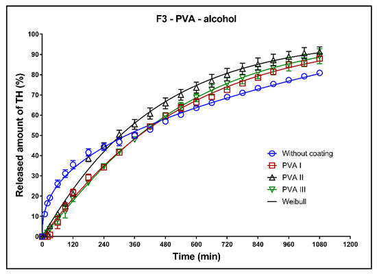 Formulation F3: The fit of the dissolution profile of the coated tablets by the Weibull model was very similar, which was confirmed by the values of the parameter ß (Table 13). The coating increased the maximum released amount. The release of TH was faster for the uncoated tablets during the first 5 h, then (owing to the steeper dissolution profile) the release from the coated tablets became the faster of the two.