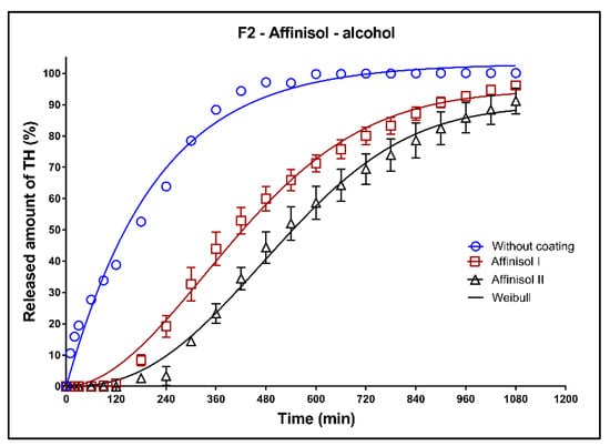 Dissolution profiles of F2 formulation in alcoholic medium (40% of alcohol) fitted to the Weibull model: uncoated tablets and tablets with Affinisol coating (two values of the perimeter thickness).