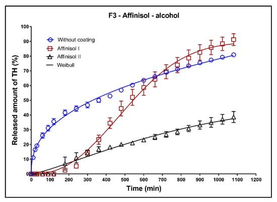 Dissolution profiles of F3 formulation in alcoholic medium (40% of alcohol) fitted to the Weibull model: uncoated tablets and tablets with Affinisol coating (two values of the perimeter thickness).