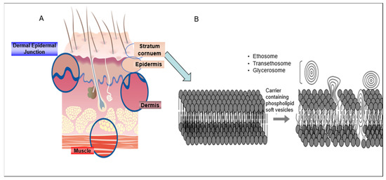 Schematic illustration of (A) the skin structure (B) the mechanism of action of carriers containing phospholipid soft vesicles.