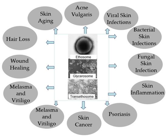 Drug delivery systems containing phospholipid soft vesicles have been widely investigated for the treatment of skin disorders including skin infections, skin inflammation, acne vulgaris, skin pigmentation disorders, hair loss and skin cancer (Figure 2). This section covers in vitro, preclinical and clinical studies conducted to evaluate the ability of these carriers to improve the treatment outcome.