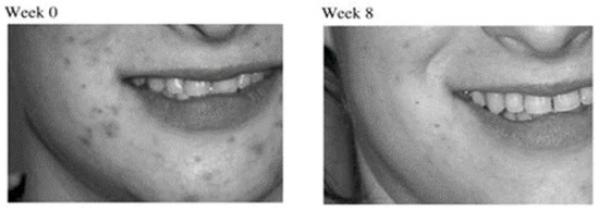 Photographs of a patient with moderate acne treated with clindamycin phosphate and salicylic acid ethosomal gel for 8 weeks at the baseline (week 0) and at the end of the study (week 8) (Reprinted with permission from ref. [31]. Copyright 2008 Wiley).