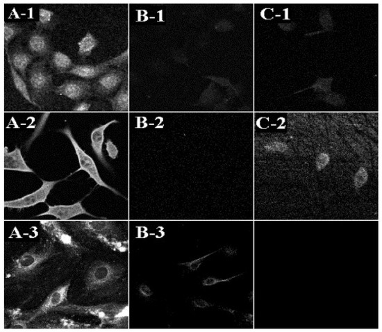 CLS micrographs showing intracellular fluorescence in fibroblasts following delivery of various fluorescent probes by ethosomes and control systems. Fluorescent probes (D289: A1–C1, RR: A2–C2 or PC*: A3, B3) were applied to 3T3 fibroblasts for 10 min from various systems as follows: ethosomes: A1–A3; liposomes: B1–B3; hydroethanolic solution: C1, C2 (Reprinted with permission from ref. [77]. Copyright 2001 Elsevier).