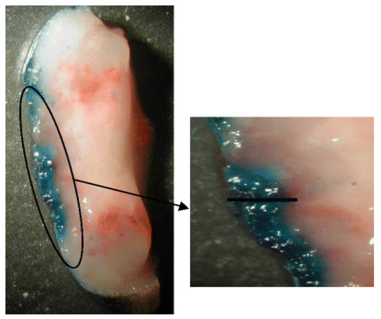 Delivery of methylene blue into the tumor from Tumorep. Photomicrographs showing delivery into the tumor of methylene blue following 4 h of application of Tumorep gel containing 1% methylene blue (bar = 1 mm). Efficient delivery of the colored probe into the tumor after 4 h is shown (Reprinted with permission from ref. [16]. Copyright 2011 Springer).