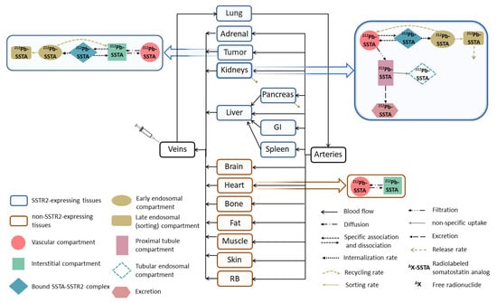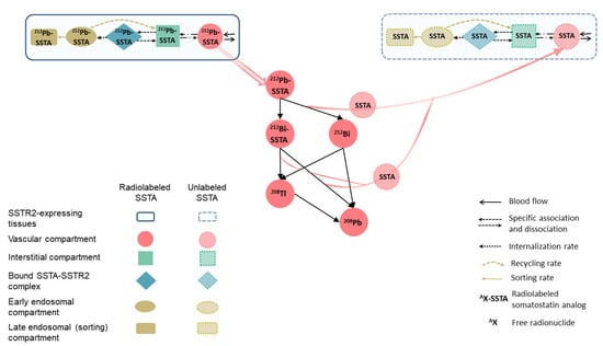 The parameters of the 212Pb-SSTA-PBPK model are classified into mice-specific and 212Pb-SSTA-specific parameters with values taken from literature (Supplementary Material Table S1) [4,16,22,23,24,25,26,27,28,29,30,31,32,33,34,35,36,37]. Briefly, the main mice-specific parameters considered in the model are blood flow, tissue volumes, relevant volumes of tissue compartments (vascular, interstitial, early endosomes and sorting (late endosomes) compartments) and SSTR2 expression on cell membranes. Relevant biological mechanisms of 212Pb-SSTA (diffusion, SSTR2-specific and non-specific binding, internalization, recycling, sorting and excretion) are included in the model. In addition, the model takes into account the physicochemical properties of 212Pb-SSTA, such as physical decay rates and the chemical stability of the 212Bi-chelator complexes after beta decay of conjugated 212Pb [23]. The distribution of 212Pb-SSTA and unlabeled SSTA is described using two similar systems sharing the same physiological parameter values [16]. The two systems are linked by the competition of 212Pb-SSTA and unlabeled SSTA for free binding sites and the physical decay rates as shown in Figure 2.