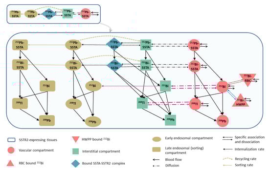 Each compartment in the 212Pb-SSTA-PBPK model represents the in vivo alpha particle generator model described before [23]. The biodistribution of free 212Bi is described by integrating a PBPK model for free 212Bi into the 212Pb-SSTA-PBPK model [29]. In short, the 212Bi-PBPK model describes the interaction of free 212Bi with red blood cells (RBC), high molecular weight plasma proteins (HWPP) and intracellular biological thiols. The detailed compartmental structure of SSTR2-expressing tissues is presented in Figure 3.