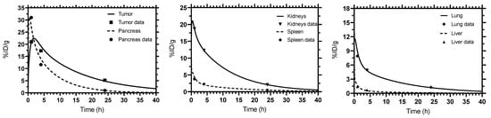 Several SSTA coupled to short-(213Bi) or long-lived alpha emitters (225Ac and 212Pb) are explored in preclinical and clinical settings to evaluate the efficacy and safety of α-SSTA for NET [1]. Studying the pharmacokinetics (PK) of in vivo alpha particle generators is challenging, especially with regard to the fate of the released radioactive products that are not easily accessible to direct measurements. A number of pharmacokinetic studies were based on blood samples [4], urine excretion, portable detectors and planar images to measure the effect of redistributed free radioactive decay products in the body [5,6,7]. As the injected therapeutic activity is much lower than the one used in diagnosis, quantitative imaging of short-lived alpha emitting daughters is limited by low spatial resolution and poor signal-to-noise ratio [8]. The use of theranostic pairs consisting of two chemically similar radionuclides (La+3 ions for Ac+3) or chemically identical radioisotopes (203Pb for 212Pb) represents a great advance, albeit more data are required to validate that concept [9,10]. For example, the biodistribution of the theranostic pairs may vary due to their different ionic radii [11,12], injected amounts [13] and half-lives [14].