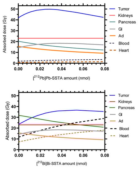 The following are available online at https://www.mdpi.com/article/10.3390/pharmaceutics13122132/s1, Figure S1: Comparison of the therapeutic potency of the in vivo alpha generator [212Pb]Pb-SSTA (upper panel) and [212Bi]Bi-SSTA (lower panel), Figure S2: Kidneys sensitivity plots, Figure S3: Tumor sensitivity plots, Figure S4: Pancreas sensitivity plots, Table S1: [212Pb]Pb-SSTA-PBPK model parameters, Table S2: Non-decay corrected %ID/g for [212Pb]Pb-DOTAMTATE in different tissues of unanesthetized AR42J-bearing mice at different time points, Table S3: The predicted values of %ID/g for relevant tissues after injecting 5 µCi of 212Pb-DOTAMTATE with a specific activity of 2.4 µCi/ng.