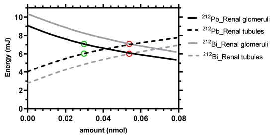 Energy absorbed in the renal glomeruli and proximal tubules resulting in 23 Gy in the kidneys depending on the administered amounts of [212Pb]Pb-SSTA or [212Bi]Bi-SSTA. The green and red circles indicate the energies released at the optimal amounts of [212Pb]Pb-SSTA and [212Bi]Bi-SSTA, respectively.