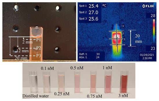 Next, the maximum steady state temperatures of different GNR concentrations (0.1, 0.25, 0.5, 0.75, 1, 3 nM) were measured at fixed laser irradiations (30 mW·mm−2 at 808 and nm). The experimental setup included a transparent cuvette (3.5 mL) filled with a known concentration of GNR solution exposed under the collimated laser beam (Figure 1). The distance between the laser pointer lens and the GNR top surface was fixed at 3 cm. The cuvette cross-sectional area (100 mm2) was significantly larger than the collimated beam area (24 mm2), which ensured the unobstructed interaction between the laser and GNRs. A thermal camera (E5, FLIR, Wilsonville, OR, USA) was positioned 30 cm away to capture a lateral image of the cuvette and laser. The camera setting was adjusted to measure temperature at three different spots on the cuvette: 2 mm, 12 mm, and 20 mm below the top surface of the GNR solution (as shown in Figure 1). The purpose was to observe the temperature distribution as a function of depth into the GNR solution and evaluate the mean value of these three measurements. The thermal camera was connected to a computer for real-time data collection at 5 Hz. Laser irradiation continued until the GNR temperature reached a steady state (temperature change <0.05 °C for 5 min). The experiment was repeated 5 times for each concentration of the solution (n = 5). A control test was conducted following a similar procedure with distilled water (blank) for comparison.