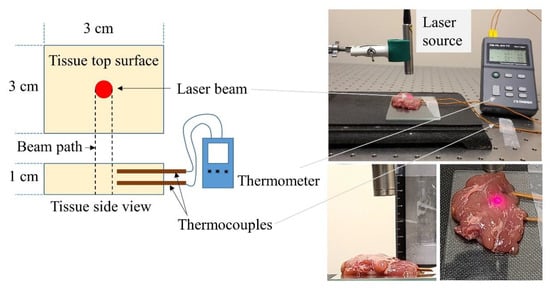 The photothermal heating experiments utilized two different continuous wave laser sources with collimated beam outputs at 808 nm (LRD-0808-PFR-01000-03, Laserglow Technologies, Toronto, ON, Canada) and 1064 nm (YLR 10-1064-LP, IPG photonics, Oxford, MA, USA) wavelengths. The collimated beam areas for both laser sources were estimated by taking a thermal image (E40, FLIR thermal camera) of the beam reflection and post-processing the image using ImageJ. The beam areas were measured at 24 and 19.6 mm2 for the 808 and 1064 nm, respectively. Collimated beam output power was measured by an integrating sphere (photo detector, 819D-UV-2-CAL, Newport, Franklin, MA, USA) and an optical power meter (1936-R, Newport, Franklin, MA, USA). The beam areas were used to set the beam intensity within the range of 20–50 mW·mm−2 (in 10 mW·mm−2 increments) for both laser sources. This range was selected through a set of preliminary tests with different laser irradiations which demonstrated that >60 mW·mm−2 irradiation would cause unwanted tissue burning (see Figure S2 in Supplementary Materials). The tissue specimen was placed on a glass slide (12 × 12 × 0.5 cm) beneath the laser attached to an adjustable holder (Figure 2). The distance between the tissue top surface and the laser was kept constant at 4 cm. Two K-type thermocouples (Fluke Co; Everett, WA, USA) were inserted into the tissue at 3 and 6 mm below the tissue surface while ensuring they were 1–2 mm from the collimated beam path. An Omega thermometer (OM-HL-EH-TC, Omega Engineering, Norwalk, CT, USA) was utilized to record the temperature reading from the thermocouples at a set frequency of 5 Hz. Both thermocouples were calibrated against a cold junction (ice) before conducting the experiments. A glass thermometer was used to measure the room temperature. The experiment started when the tissue’s initial temperature reached room temperature (22 °C). Laser emission continued until the tissue temperature reached a steady state maximum range, i.e., temperature fluctuation was <0.05 °C for 5 min. At this point, the laser was turned off to allow the tissue specimen to cool normally (no forced convection) to room temperature. The experiment was repeated 5 times with different specimens (n = 5). A similar procedure was followed for experiments with two different laser sources and four different light intensities.