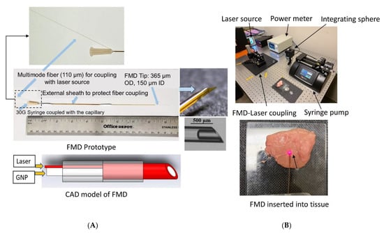 (A) Fiberoptic microneedle device (FMD) (Reproduced with permission from [32], Elsevier, 2020 and (B) the experimental setup for tissue photothermal heating with FMD at 808 and 1064 nm wavelengths.