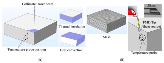 Computational modelling of ex vivo tissue photothermal heating by (A) collimated beam and (B) FMD. From left to right: probe positioning for the collimated beam model, boundary conditions imposed on the model, computational mesh used for FEA, FMD model, and probe position.