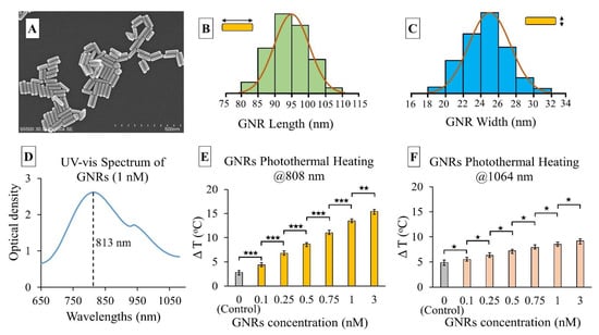 (A) SEM image of the GNRs; representation of GNRs’ size-frequency histogram of n = 100 distribution as determined from SEM image analysis: (B) GNR length (95.2 ± 4.7 nm), (C) GNR width (24.8 ± 1.5 nm), average aspect ratio (length/width): 3.83; (D) UV-vis absorption spectrum of a sample GNR solution (1 nM concentration) with an absorption peak at 813 nm wavelength; temperature rise (∆T) vs. GNR concentration graph when exposed to 30 mW·mm−2 beam at (E) 808 nm, and (F) 1064 nm laser wavelengths. The error bars represent mean ± 1σ (standard deviation) for n = 5 trials. Student’s T-test showed the statistical significance between two consecutive GNRs’ concentrations and control (distilled water) which are represented by ★ symbol. ★ = p < 0.05, ★★ = p < 0.01, and ★★★ = p < 0.001.